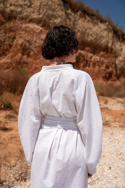 O rochie lungă cu o croială dreaptă și lejeră, confecționată din pânză topită de bumbac, cu textură soft-crep ce revine natural după fiecare spălare. Guler mandarin, mâneci lungi raglan cu formă curbată și nasturi din sidef. Prevăzută cu buzunare laterale și crăpături adânci pe părțile laterale. Se poate purta cu sau fără cordonul inclus.