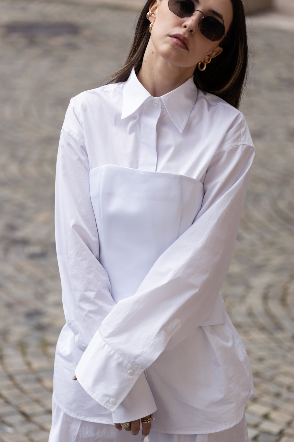 Un papion reinterpretat din twill negru, o alegere de accesorii îndrăzneață, dar sofisticată.
